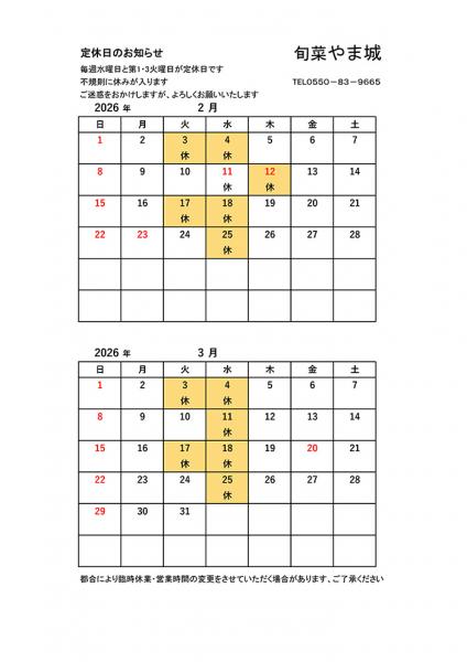 いつも旬菜やま城をご利用いただきありがとうございます。